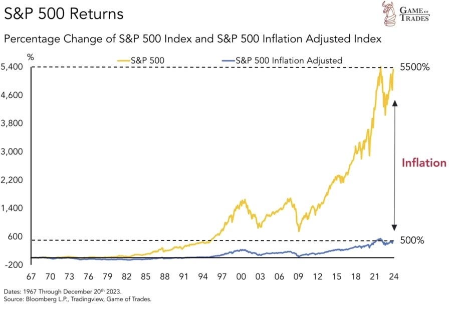 During the fiat experiment’s 53 or so years, equity prices have risen by about 500% adjusted for inflation and ten times as much in nominal terms. That’s what monetary inflation does to financial asset prices.