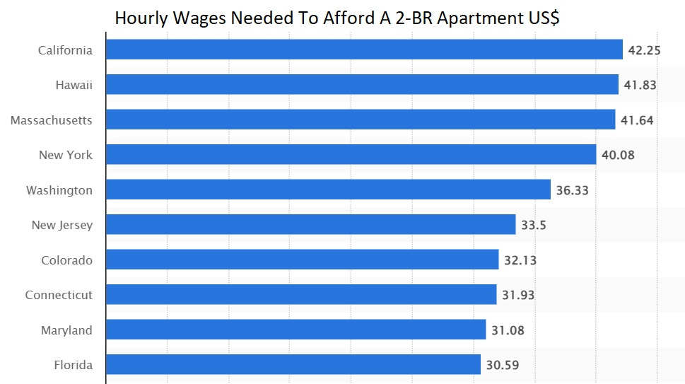 Rental apartments were cheap in the 1970s and 80s, but since then, inflation has sent them up much faster than incomes. In high-cost-of-living states, it takes an hourly wage of between $30 and $42 to afford a 2-BR apartment. $30/hour equals $60,000 per year. How many millennial or Gen-Z workers make that kind of money? Probably fewer than half.