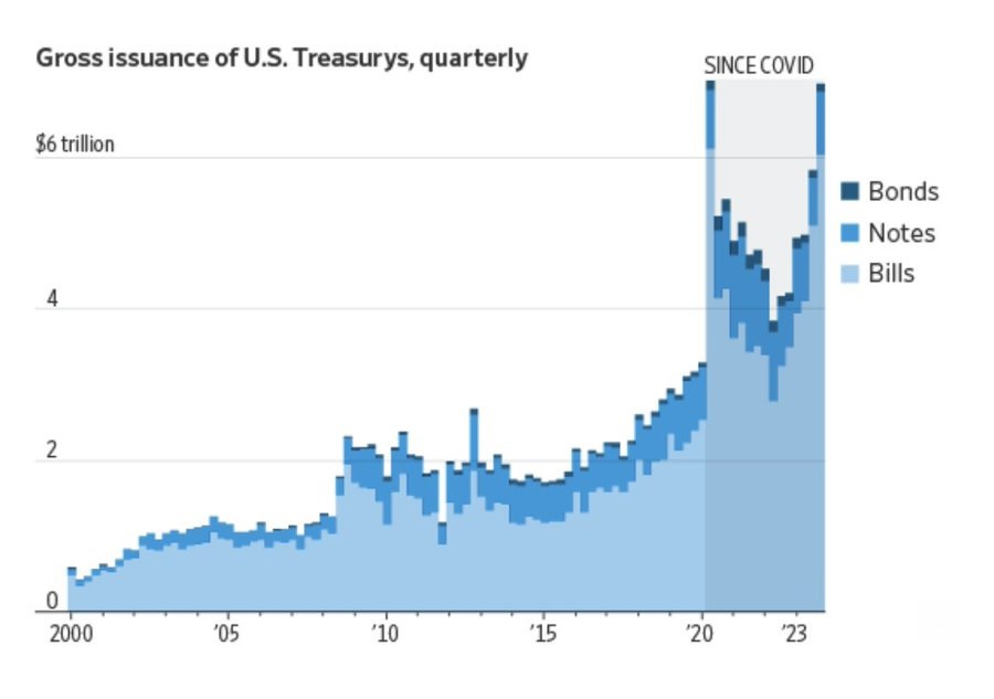 Big Trend #1: Governments around the world have basically given up on fiscal or monetary discipline, and have entered the blow-off stage of currency debasement. The US government’s borrowing — already dangerously aggressive pre-pandemic — has now gone almost literally off the chart. The current schedule calls for $10 trillion of new paper to be sold in 2024, raising the question of who will buy it. The answer: If China declines (as it will), the only remaining candidate is the US Fed and its printing press.