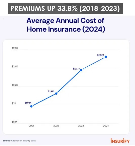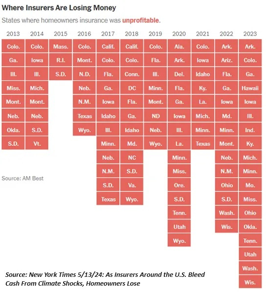 Anecdotally, we're hearing accounts of basic home insurance jumping from $3,000 to $13,000 annually in high-risk regions. We're also hearing of insurers abandoning high-risk areas and entire states, leaving homeowners with few options for insurance. In response, some homeowners are "self-insuring," i.e. they have dropped insurance coverage.