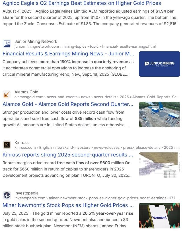 This year’s second quarter (which ended June 30) was the best ever for gold/silver miners. Here’s the first page of a Google search for “gold miner Q2 earnings”: