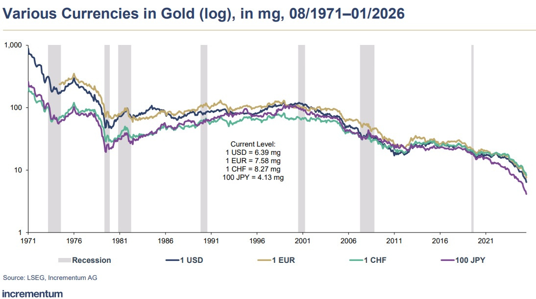 When valued in gold, the major fiat currencies have been in terminal decline since 1971. The trend appears to be accelerating.