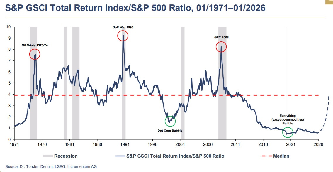 But the fun isn’t over. Commodity stocks in general—represented by the Goldman Sachs Commodities Index (GSCI) — are closer to a historical bottom than to a cyclical top.