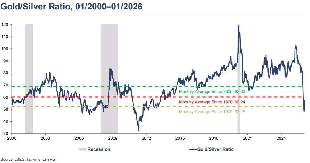Another way of saying the above is, “The gold/silver ratio is plunging.”
