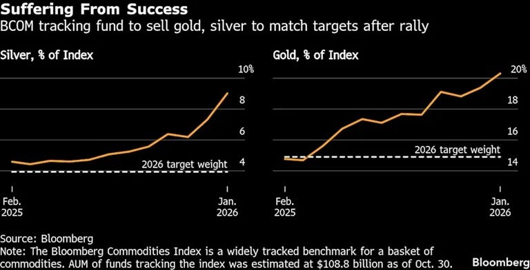 Silver – which fell more than 3% on Thursday – is particularly vulnerable to a sharp selloff. Citigroup Inc. estimated about $6.8 billion in silver futures could be sold to meet the rebalancing requirements, equivalent to about 12% of open interest on Comex.